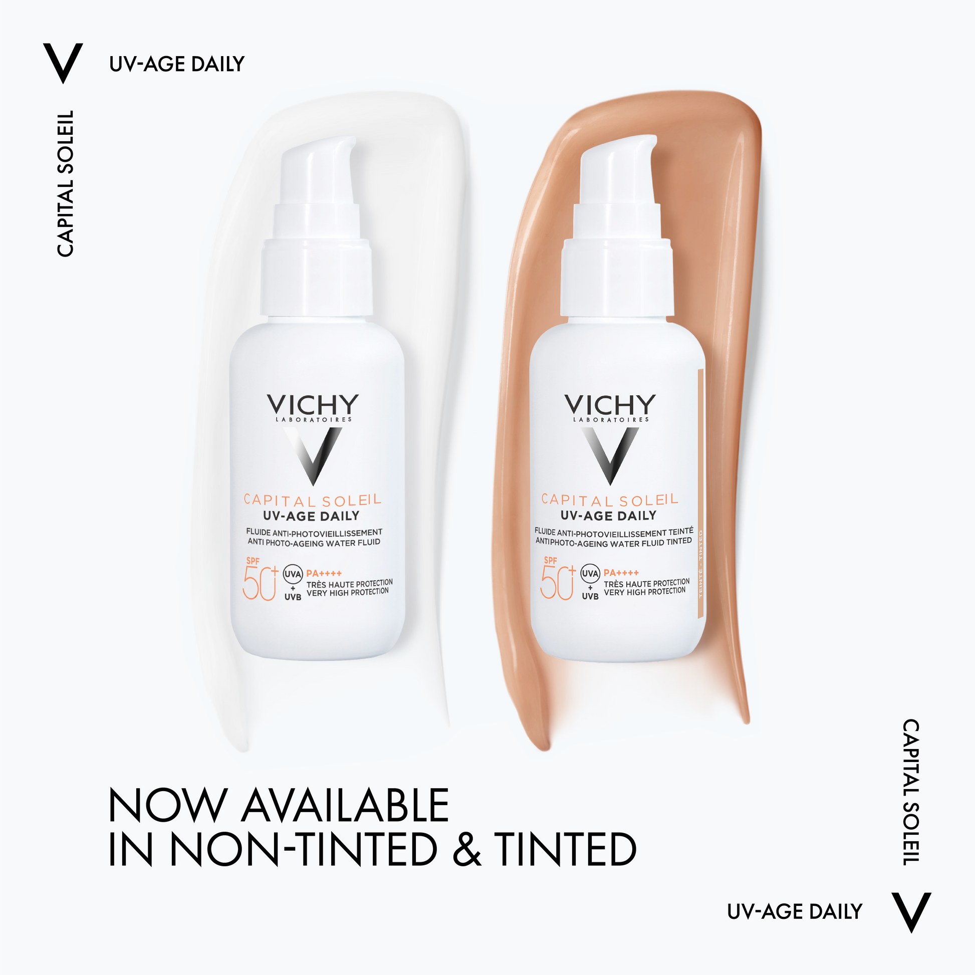 Vichy  Capital Soleil UV - Age Tinted Anti Ageing Sunscreen SPF50+ is an advanced high protection facial Sunscreen with a water fluid texture that helps protect the skin from the damages of UV radiation and pollution whilst targeting existing signs of photo-ageing. Its formula delivers a light coverage to unify and enhance skin tone.The very high broad spectrum UVA and UVB sunscreen, enriched with powerful dermatological-actives: Peptides, Niacinamide and Vitamin E combined with multi-patented Netlock technology, protects the skin and helps to correct UV-induced wrinkles and dark spots, while strengthening the skin’s defense barrier function.Capital Soleil UV Age Daily SPF50+ is the essential final necessary step in your daily skincare routine, all year round. The lightweight, breathable texture combined with advanced suncare technology provides uniform invisible coverage, that leaves no white cast or tacky finish. Skin looks healthier, smoother and feels protected.